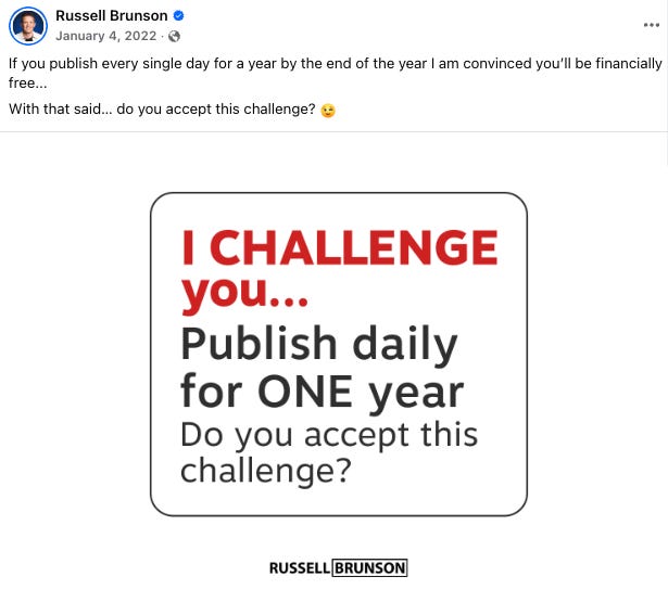 This is a quote by Russell Brunson. Funnily enough, at that time I also was an affiliate for his company, Clickfunnels. But I found him to be one of the most annoying people on the internet because the product was really good but felt really spammy. Every click would open a new video or funnel sales page. He was ahead of his game.
